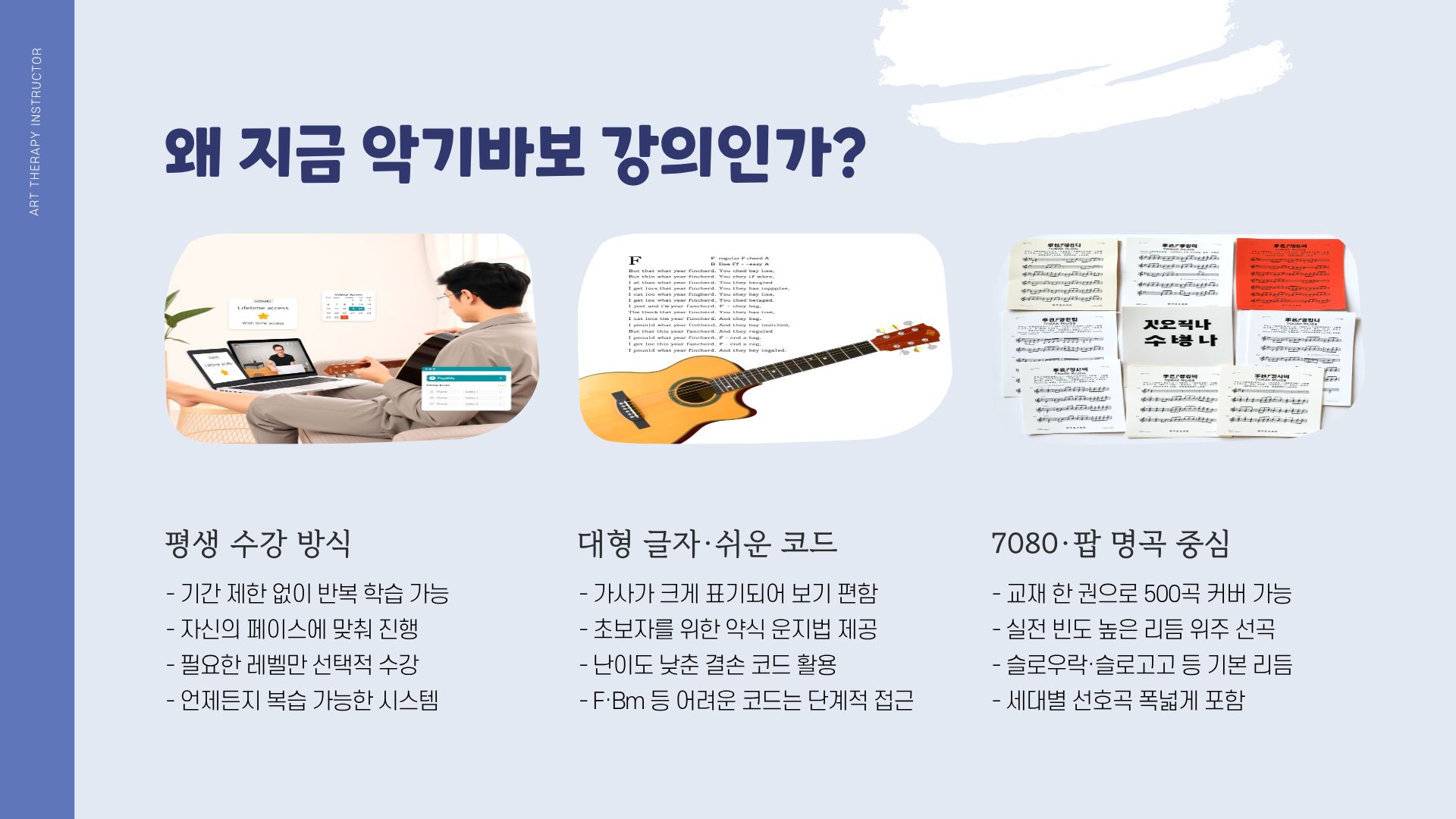 - 교재: 가사 크게, 난도 낮춘 코드 수록(결손 코드·약식 운지 포함). F·Bm 등 난이도 구간은 단계별로 천천히 도달.